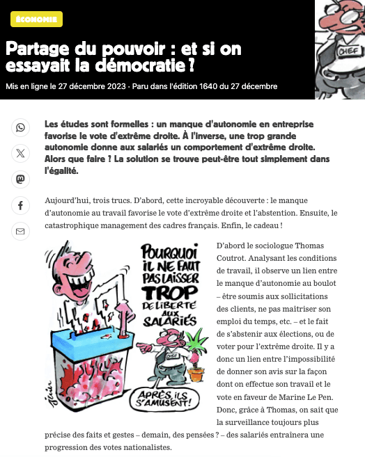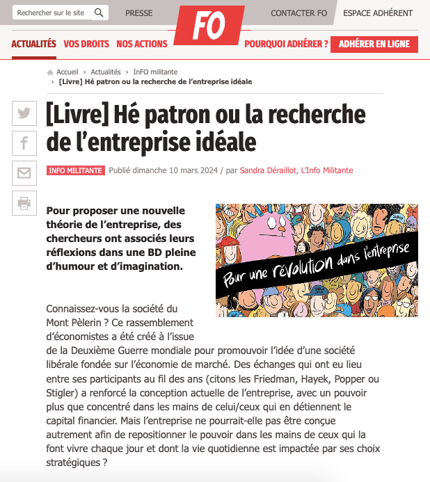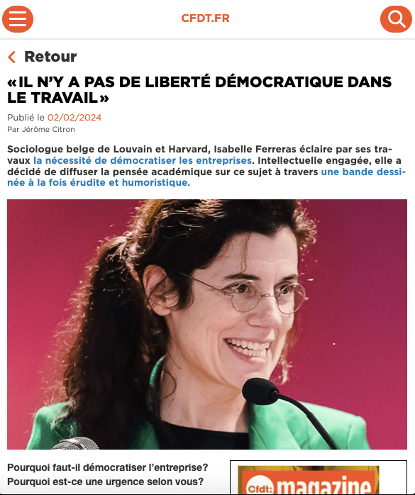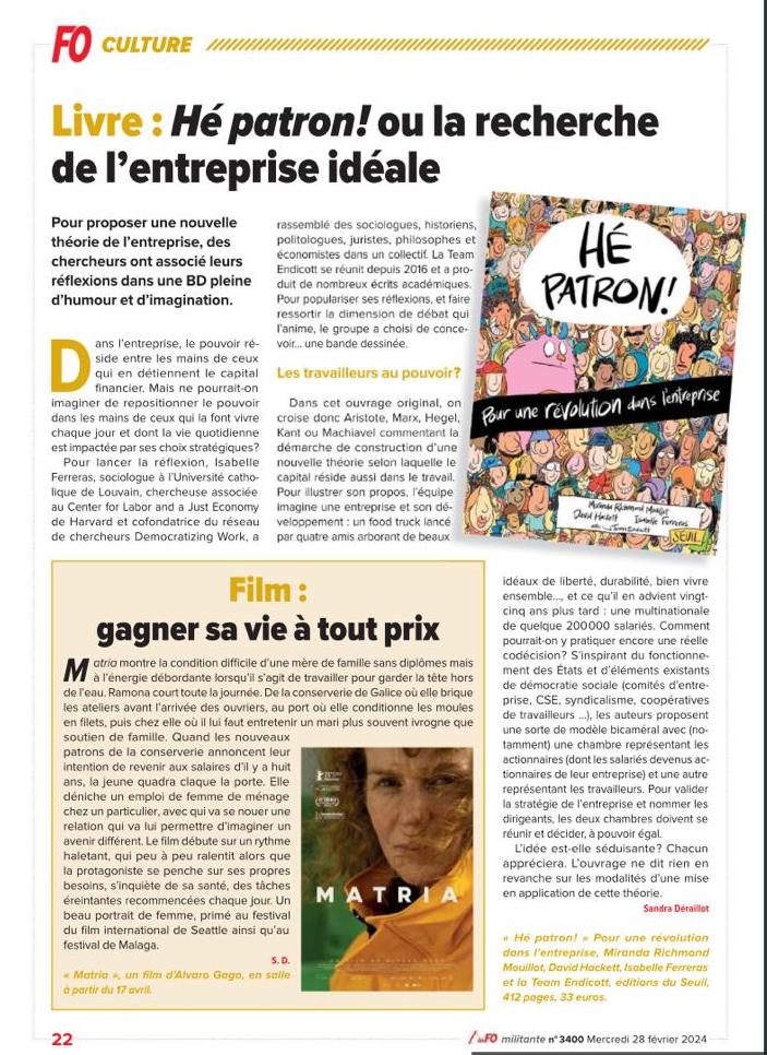« Alors qu’il parait normal, dans nos sociétés démocratiques, d’élire nos dirigeants et, plus globalement, de faire entendre notre voix, il est admis qu’il en soit tout autre dans le monde du travail, où les patrons prennent la plupart de leurs décisions sans demander l’avis des employés. A travers le roman graphique « Hé Patron ! Pour une révolution dans l’entreprise », paru aux Editions du Seuil, un panel d’experts revient sur cette problématique. Mais aussi sur les travers du modèle entrepreneurial actuel. Et propose des pistes pour un fonctionnement plus démocratique au sein des entreprises. Un ouvrage coordonné par Isabelle Ferreras, professeure à l’UCLouvain et maître de recherches FNRS associée aux Universités de Harvard et d’Oxford. »…