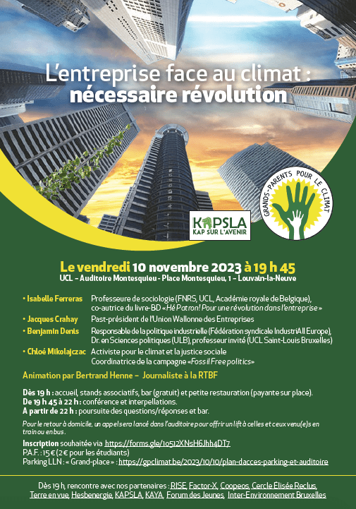 Le vendredi 10 novembre, Les Grands-Parents pour le Climat en partenariat avec RISE, Factor-X, Coopeos, Cercle Élisée Reclus, Terre en vue, Hesbenergie, KAPSLA, Forum des Jeunes, Inter-Environnement Bruxelles, KAYA organisent à LLN une conférence-débat sous le titre: