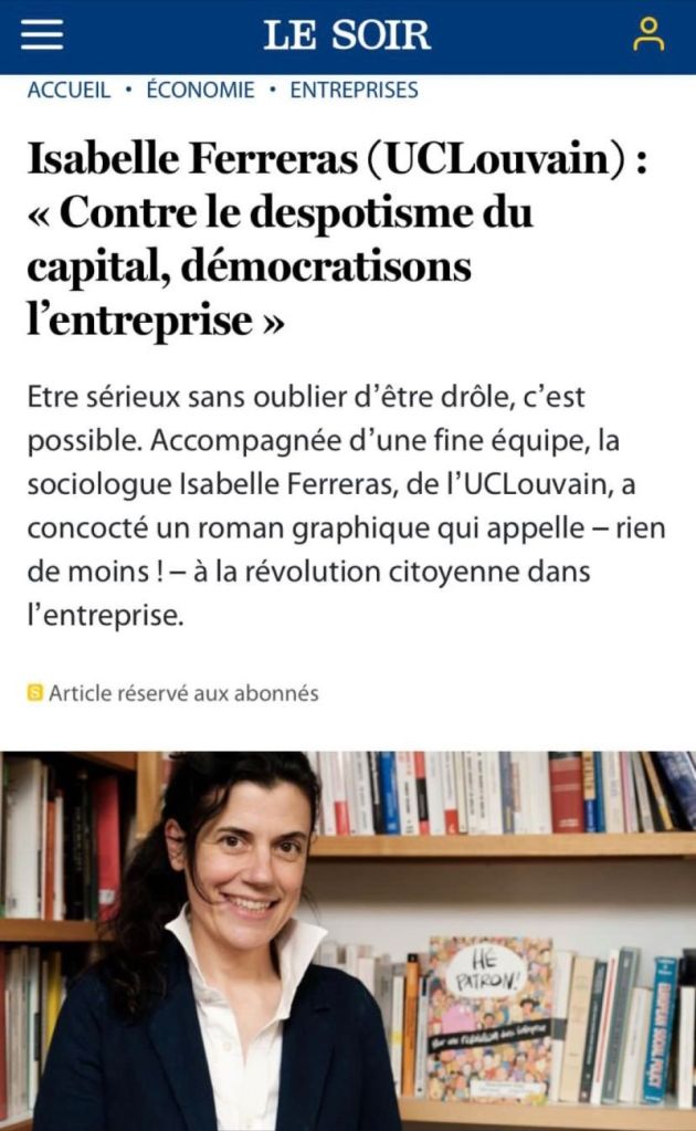 Dans notre roman graphique « Hé Patron! Pour une révolution dans l’entreprise » qui vient de paraître au Seuil (Paris), nous racontons une histoire : celle du Soup Group et de la place des investisseurs et investisseuses en travail dans les décisions stratégiques de l’entreprise. Nous ? Une équipe de chercheuses et chercheurs du monde entier. Nous proposons une transition démocratique dans l’entreprise. Quelques extraits de l’entretien d’Isabelle Ferreras dans Le Soir du 13/11: